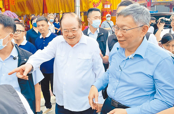 民众党主席柯文哲(右)12日到三重先啬宫参拜,董事长李乾龙(左)亲自接待。(图片来源:台湾“中时新闻网”)