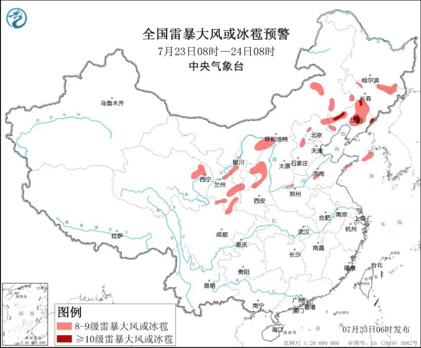 中央气象台7月23日06时继续发布暴雨蓝色预警和强对流天气黄色预警。预计,7月23日08时至24日08时,甘肃东部、宁夏南部、陕西中部、川西高原北部、四川盆地西北部、吉林南部、辽宁中北部、广西南部等地部分地区有大到暴雨,其中,甘肃东部和陕西中部偏西地区等地局地有大暴雨(100~140毫米)。上述部分地区伴有短时强降水(最大小时降雨量30~50毫米,局地可超过80毫米)(见图1),内蒙古中东部、黑龙江东南部、吉林西部和北部、辽宁中北部和西部、青海东部、甘肃东部和南部、宁夏西部、陕西中北部、北京西北部和西南部、河南北部、四川北部等地的部分地区将有8级以上雷暴大风或冰雹天气,其中,辽宁中北部和西部等地局地将有10级以上雷暴大风,最大风力可达12级以上。