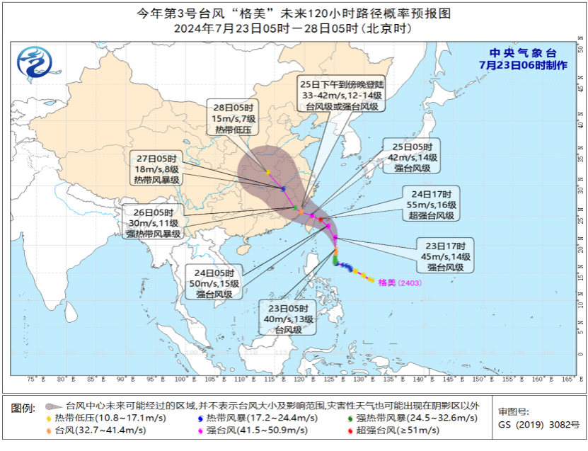 今年第3号台风“格美”未来120小时路径概率预报图(7月23日05时-28日05时)