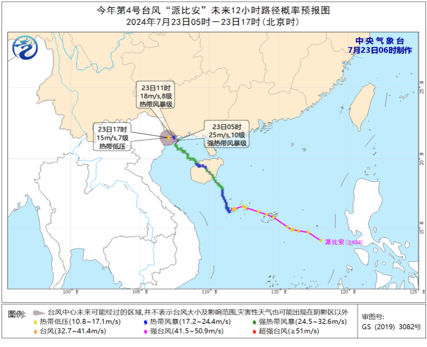 今年第4号台风“派比安”未来12小时路径概率预报图(7月23日05时-23日17时)