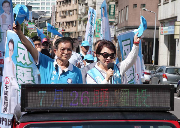 针对“大罢免”,台中市长卢秀燕(前右)5日首次投入台北市反罢免行动,与国民党民代赖士葆(前左)举行车队扫街 ,呼吁大家投下反对罢免选票。(图片来源:台湾“中时新闻网”)