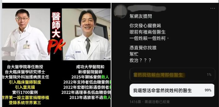 还有岛内网友发起了网络投票:“帮网友提问,你突发心脏衰竭,眼前有两个医生,一个姓柯、一个姓赖,凭直觉,你会找谁帮忙救治?”结果共投出1416票,仅有1%的网友选择“当然找信赖台湾那个医生”,而99%的网友则投给“我还想活命,当然找姓柯的医生!”