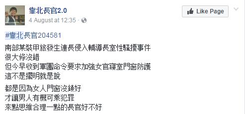 “靠北长官”Facebook又有爆料说事件发生后收到台军团命令要求加强女官寝室门窗防护!
