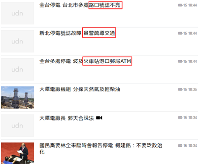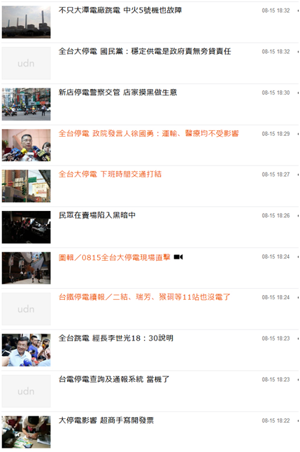 守在电脑前的撩叔发现,从15日晚5点多停电开始,每过几分钟台媒就会有一条相关报道出现。