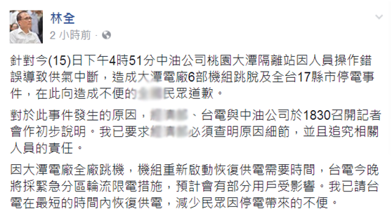 这场闹剧在15日晚间9点终于落幕,全台电力逐渐恢复正常。台当局“行政院长”林全跑到脸谱网向全体台湾民众道歉。