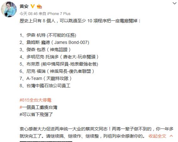 比如台湾艺人黄安今日上午就在微博上发布了调侃文章,并称“一个员工瘫痪台湾,可以省下飞弹了”。