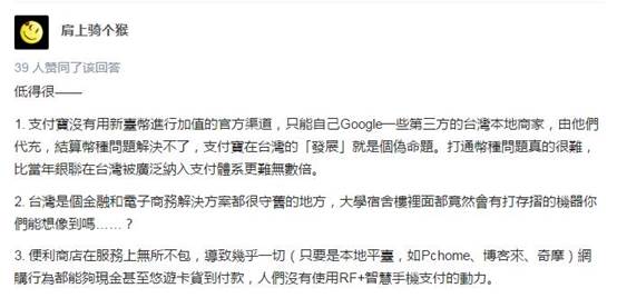 更有网友直言:台湾是个金融和电子商务解决方案都很守旧的地方,支付宝想在台湾发展根本就是个伪命题。