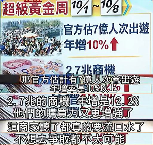 今年,大陆约会有7亿人次会出游且大概会创造出2.7兆(台湾方面所使用的“兆”为1万亿新台币)的十一“超级黄金周”,台媒羡慕的表示,如此商机真是令不少台湾观光业的商家都垂涎。