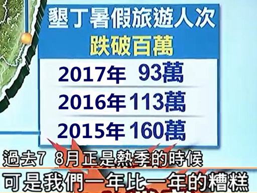 以垦丁为例,其原本是“暑期游”的大热之地,可是近两年的情况一年比一年糟糕,今年的暑期旅游人次更是跌破了百万大关。