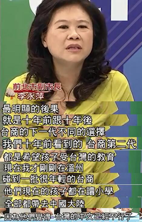 前台北市副市长李永萍更以亲身经历讲述了近十年来台商对于下一代教育的不同选择:如今年轻台商的孩子都在大陆学习,因为他们觉得台湾的中文教育已经不行了。