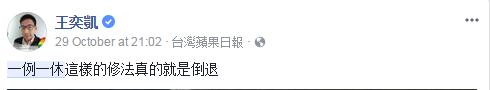 这里再给各位讲个知识点:在岛内现行的“劳基法”中规定“劳工每七日中应有二日之休息,其中一日为例假,一日为休息日”,但未明说例假应该怎么排,故而早期时有“七休一”函释,即为两例假应间隔6个工作日,但如征得工会或劳工同意,例假可挪移,后因可连上12天班的“弊端”遭批;之后蔡英文当局上任,另以新“函释”废止旧“函释”,又规定两例假间最长就是6天,硬性规定了“一例一休”,但没想到这次的“修法”却又松绑了“七休一”……新党新思维中心主任侯汉廷也在脸谱网怒斥称:有关“一例一休”每一个修订,都是越修越糟!