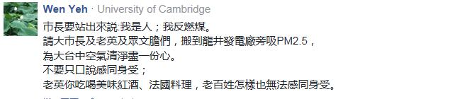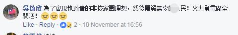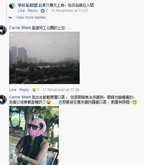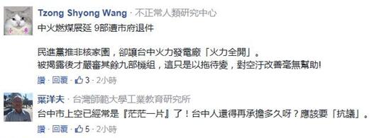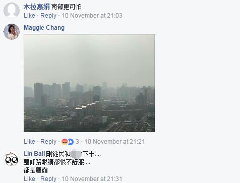 “空气真的很差,我儿子气喘都发作了”、“台中会在第一线用肺帮全台湾过滤”,深处“霾”伏中的台中民众除了愤怒就是无奈,“为了实现执政者的‘非核家园’理想而‘屠杀’无辜民众”、“台中火力发电就吸饱饱了,用肺过滤空气,我们的烂领导人却还在‘用爱发电’”。