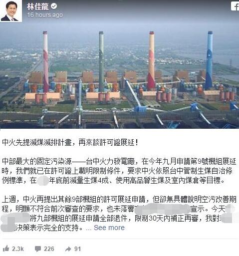 再回头看看台中火力发电厂那一根根大烟囱吧,它们被直指是危害中部空气品质的“杀手”,颜宽恒曾上传过一张台中电厂的照片,“嗯??我刚刚到台中电厂,猛一看发现‘烟囱不见了’”,还调侃说是以为“蔡当局痛定思痛了”。