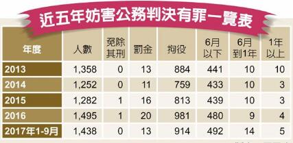 统计指出,2013年到今年9月,近5年因触犯“妨害公务罪”而被判有罪的共6825人;判决有期徒刑6个月以上要入监服刑人数仅78人,其中2013到2016年,每年约13到20人,今年前9个月共19人,仅占这5年全部有罪人数比例的1.1%,其他98.9%涉犯“妨害公务罪”者,都是判处罚金、拘役和6月以下徒刑。