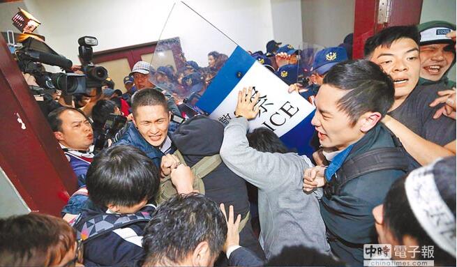 图为反服贸学生冲入“行政院”办公室内,与卫警发生严重推挤的画面。(图片来源:台湾《中时电子报》)