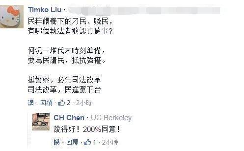 对此,也有台湾网友发表了自己的看法:挺警察,必先“司法改革”;若想“司法改革”,民进党就得下台!