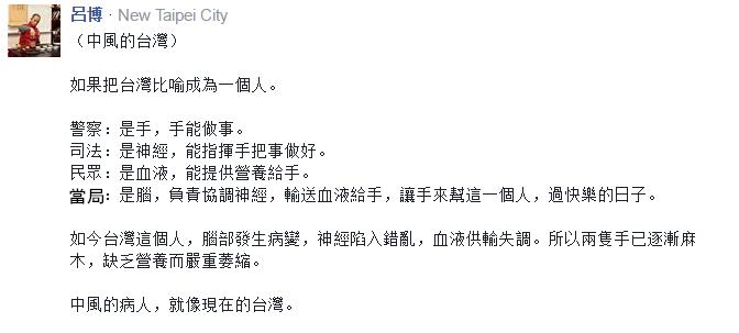 打击犯罪、维护治安是警察的天职,但也需要各方的配合,可7万的台湾警察如今不仅难逃被民进党政治阴谋戕害的命运,本该护己有利司法系统也有崩坏的危机……诚如台湾网友所形容的,若将台湾比作“一个人”,那么如今的台湾因蔡当局的缪政和操弄已经变成一个“中风的病人”了。