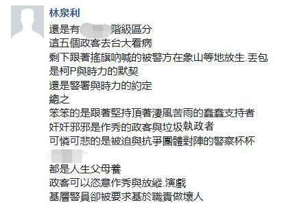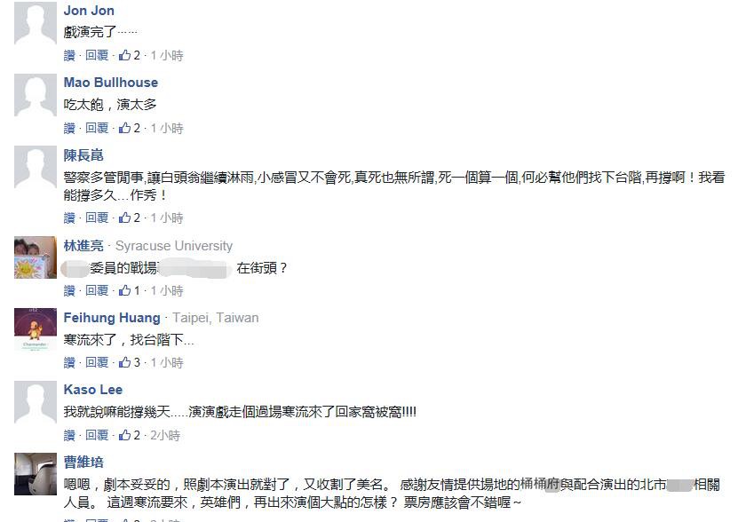 据台湾《中时电子报》报道,黄国昌稍早时还在脸谱网(facebook)表示,“很久很久没有如此难过”,不是因为全身湿冷、不是因为超过40小时未进食、而是因为本来以为2016改变已经发生,“没有想到我所热爱的台湾权柄的滥用,竟然依旧如此冷酷”;而当警方不断柔性劝导其早点“离开休息”时,他又反唇相讥“你不要再演戏了”!