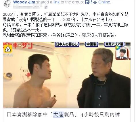 日本曾做过一项关于家中“中国(大陆)制造”商品的调查,结果显示若想要全面舍弃“中国(大陆)制造”的话,日本人到最后会只剩下一条内裤不是其产出的;而在一本名为《离开中国制造的一年:一个美国家庭的生活历险》的书中,这家人最终感慨,没有“中国(大陆)制造”,生活一团糟。
