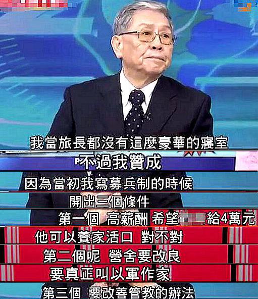 他还直言,自己在当旅长时都没住过这么豪华的寝室。不过,他随即表示,如果蔡当局真能把士兵宿舍改成这样,自己绝对赞成。帅化民还透露,自己当初在写“募兵制”时曾提过三个条件,而若真能被采纳,那现在台军大概也不会面临招不上人来的窘境了。