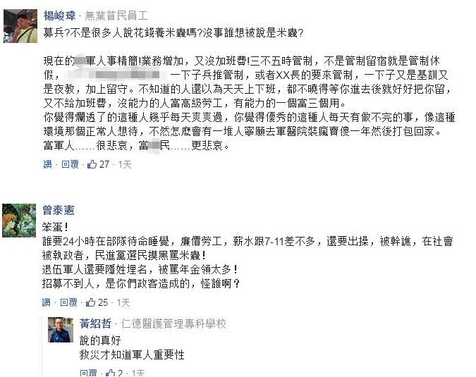 此外,从众多评论中侃爷还发现,台湾网友除了对被民进党当局称军人是“米虫”不满外,“廉价劳工”也是在形容台湾士兵时出现频率很高的一词。