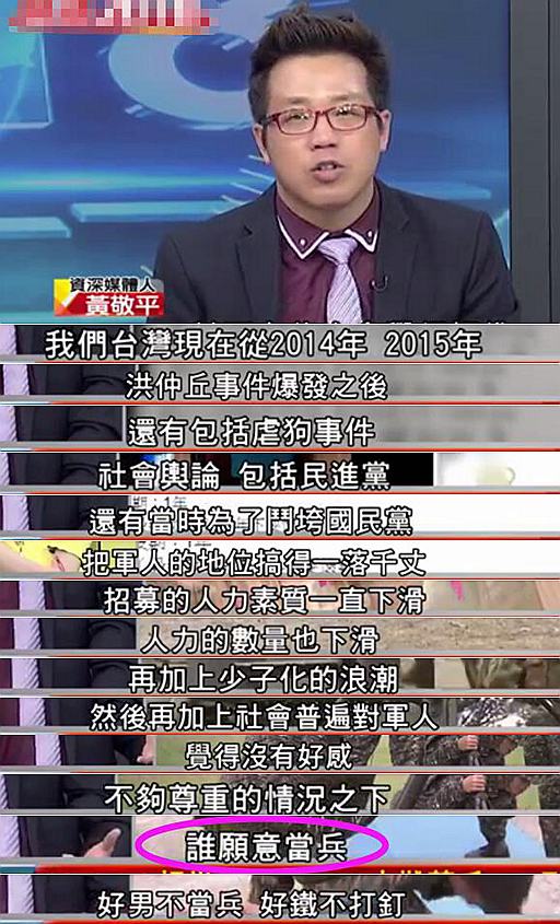 其实,不怪台湾民众排斥当兵,且不说有重创军人利益的年改,蔡英文当局对待军人的态度也令人不齿,“有事军人干,没事干军人”的做事风格不仅伤了台湾士兵的心,也让岛内民众对当兵一事避之不及,台湾资深媒体人黄敬平更用“好男不当兵,好铁不打钉”形容全台民众现今对当兵一事的态度。