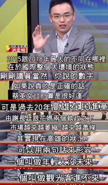 国民党发言人洪孟楷先发制人的表示,如果议员给出的数字是正确的话,那只能说“蔡英文算是很好运”,而事实是,高雄在民进党近20年的执政下,现况用两句话就能形容:1)年轻人没未来;2)观光客进不来。