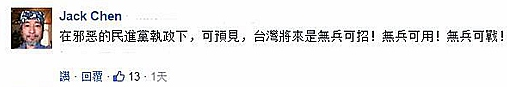 对此,岛内网友表示,“污蔑、诋毁军人的民进党,居然能够高票当选台湾当局的执政者,不禁要心疼这些被当作炮灰的士兵们一秒钟”;还有人认为,在邪恶的民进党执政下,台湾的将来就是无兵可用……