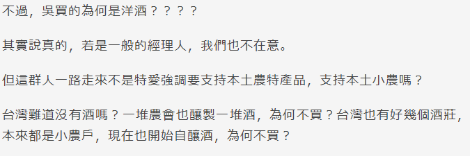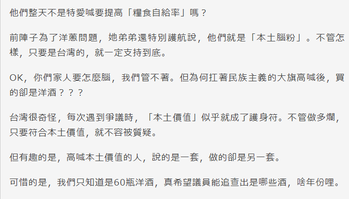 再来说送礼的内容,洋酒。以往蔡英文曾被爆料爱吃法国大餐,这回吴音宁送礼送洋酒算是对上了。只不过你吴音宁口口声声说要支持本土农产品,霸占道德高地,到头来却做起了洋酒“生意”,不觉得脸疼吗?下面这位台湾网友说出了大部分人心里的感受: