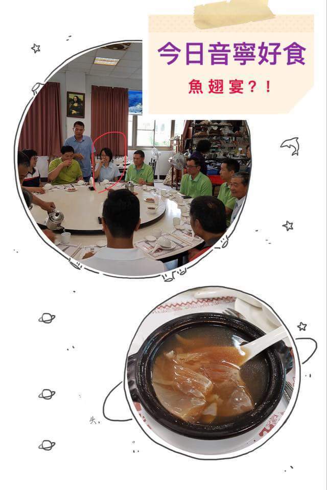 游淑慧在脸书上po出吴音宁坐在餐厅圆桌与大家聊天及鱼翅料理的照片,照片上并打出“今日的音宁好食鱼翅宴”。