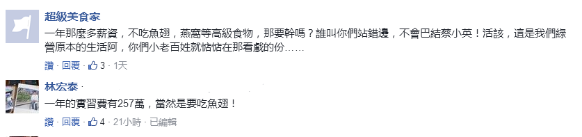 她表示,5月9日吴音宁还在脸谱网大谈,北农的基层有多么辛苦,所以为北农加薪!5月11日,她就在高雄吃鱼翅。蔡英文吃法国料理挨轰、李应元吃鱼翅道歉,比起他们的小老妹日子爽爽过,其实还真冤枉了。