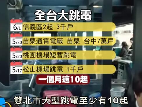 据台湾《中国时报》报道,从4月起,包括花莲、高雄、苗栗、台北和新北等地皆频发跳电和停电事故,其中苗栗通霄电厂5月30日发生的输电线路跳脱故障,致使苗栗及台中约7万多户停电。有数据统计,仅五月份,台北和新北地区就跳电了11次!