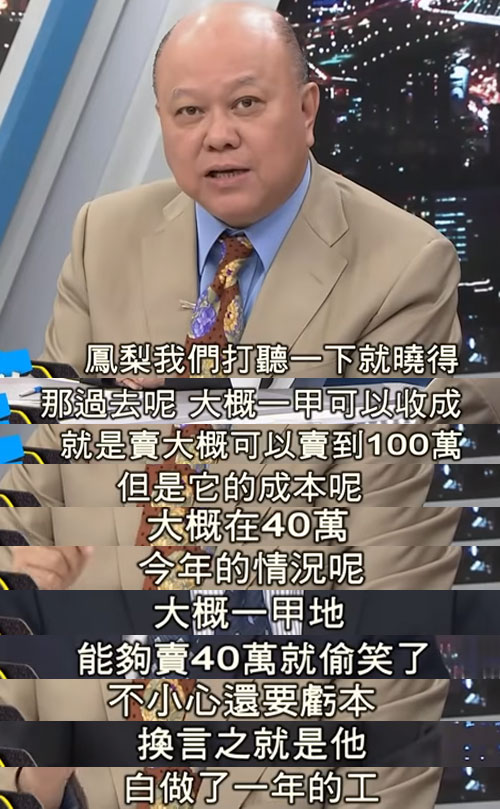 而对于林聪贤的辩驳,李胜峰则给出了一组数据:过去在台南,农民自整地到种植凤梨,1甲地(约14.5亩)的收成大概可以卖到100万,而它的成本在40万左右,盈利额约为60万;而以今年的情况来看,1甲地的凤梨能卖40万就要偷笑了,一不小心还会亏本,果农们整年的辛苦很可能变成无用功。