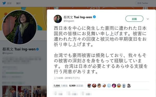 日本西部和中部连日暴雨成灾,引发河流泛滥和泥石流,截至当地时间8日晚10时,死亡人数上升至85人,并有近百人失踪,上千人等待救援。对此,台湾当局领导人蔡英文7月7日特地用日文发推特表示愿协助日本。她说:“对日本遭受严重暴雨的人民致上慰问之意,也祈福受灾地区和人民能早日回复。台湾也常受到暴雨的侵袭,深刻体会暴雨成灾的严重性,台湾已做好准备,必要时可提供日本支持。”