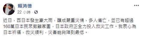 继蔡英文表示愿协助日本后,台当局“行政院长”赖清德也于脸谱网PO文表示,“近日,西日本发生豪大雨,酿成严重灾情,多人伤亡,并已有超过160万日本民众撤离家园,日本政府正全力投入救灾工作。我衷心为日本祈福,救灾顺利,灾害能够降到最低。”