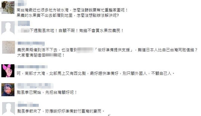 对于蔡英文要提供日本援助的说法,台湾网友痛批:“南台湾最近也很多地方被水淹,怎么没听说要帮忙重整家园呢”“下周台风来啦,自顾不暇,有钱不会买水果救农民!”“农民果贱伤到活不下去,也没看到蔡当局做好准备提供支持,难道日本人比自己台湾同胞值钱?”“台风季已开始,先把台湾顾好吧”。