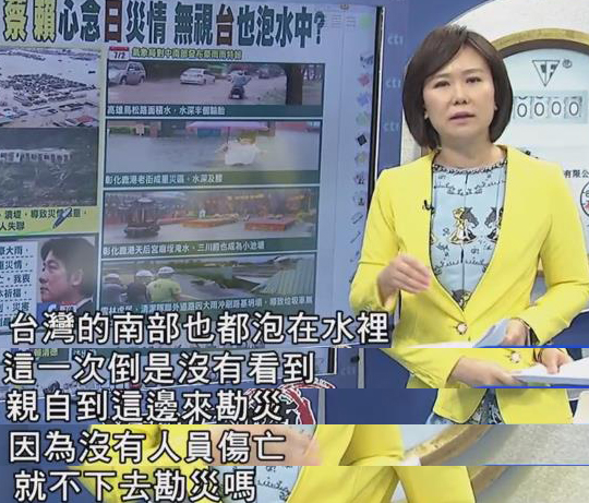 南台湾受到暴雨侵袭一个星期,台湾南部也都泡在水里,却没有看到蔡英文和赖清德南下勘灾,主持人在节目中质问:“难道因为没有人员伤亡就不下去勘灾吗?”