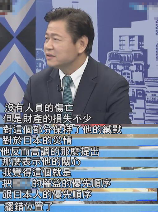 对此,台湾政论节目嘉宾表示,没有人员伤亡,但是财产损失不少,蔡英文和赖清德对此保持了他们的缄默,对日本灾情反而高调表示他的关心,完全是把台湾人和日本人的权益优先顺序摆错了位置。
