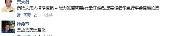 不少网友表示“这就是蔡英文的用人模范啊”、“故宫‘民进党化’了啊”……