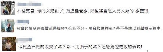 对此,台湾网友纷纷表示:“有这种老爹,以后将会是人见人讨厌的爹宝”“台湾的检察官素质就这样?公私不分,威胁取供办案?”“做检察官做得太爽了吗?都不用脑子的吗?这样荒腔走板的表现”。