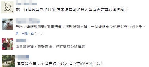 有的网友回复“伤害跟损毁,告好告满!也许还有公然侮辱”,有的网友强调“让座是心意,不是义务!妇人是抢夺的野蛮行为”,还有的网友甚至说:“就一个博爱座就能打架,看来还有可能杀人,坐博爱座要有心理准备了”。