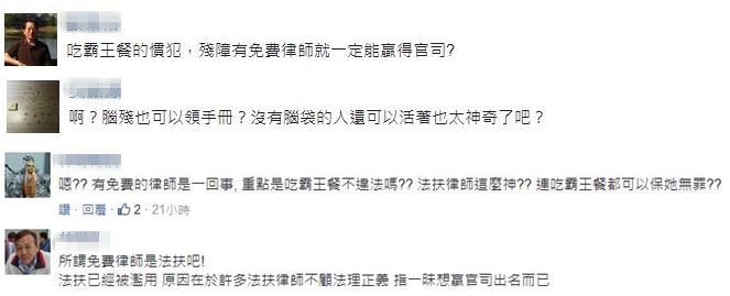 网友们纷纷替店家不平,称“吃霸王餐的惯犯,残障有免费律师就一定赢官司?”也有人讽刺说“没有脑袋的人还可以活着也太神奇了吧?”。