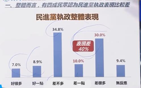 在台湾竞争力论坛30日公布的民调中,有高达64.1%的受访者不满意台湾地区领导人蔡英文的执政,相较今年2月所做的民调,不满意度又增加3.8%;且有4成民众认为民进党执政以来的整体表现比国民党执政时还差。