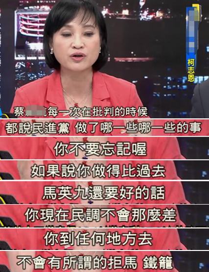 国民党民代柯志恩则表示,蔡英文每次批判马英九和国民党时,都说民进党做了很多事,但“如果你做的比马英九还要好的话,你现在民调不会这么差,你去任何地方也不会有拒马和铁笼”!