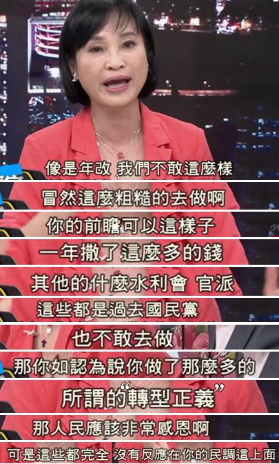 更反呛蔡英文“你认为做了很多所谓‘转型正义’的事儿,那人民应该非常感恩啊”,可惜并没有体现在民调上!