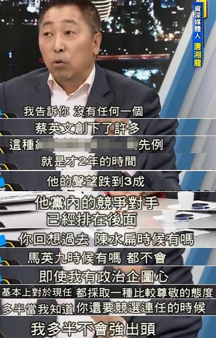 资深媒体人唐湘龙也表示,蔡英文执政才2年,声望就能跌倒3成一下,简直“不可思议”!