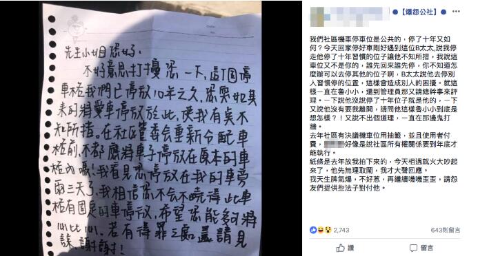 此外,她还在“爆怨公社”PO出了张去年该邻居留下的纸条,留言中“停放十年的车格被停走,不知所措”的论调与当天发生的状况如出一辙。