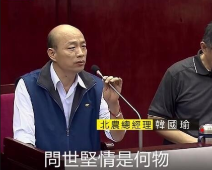 也是因为这个原因,才有了后来的经典桥段。当年韩国瑜担任北农总经理时,王世坚“疯狗咬人”似的质询,大骂韩国瑜“流氓”,韩国瑜则四两拨千斤的用一句话怼了回去,这就是闻名岛内的“问世坚情是何物”~