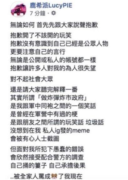 他表示,这篇文章是他在未公开的群组内发文,用语也都是好友间平日聊天时才会用的夸张语法,其实并没有要炸弹台北市政府的动机,但不想会被人公布,造成这么大的风波……