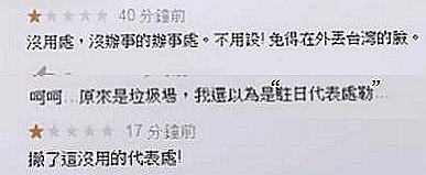 如此傲慢冷漠的态度也让日本人看不下去了。有台媒报道,位于东京都的“台北驻日经济文化代表处”在“Google”上的评价中甚至出现许多日本人用日文大肆批评的声音,“态度非常糟糕,这就是台湾的服务吗?”、“接待水平真糟糕,对台湾来说真的是一种耻辱”、“工作态度傲慢、这里的服务太离谱了,气死我了”、“这就是台湾人?我讨厌台湾人!”……
